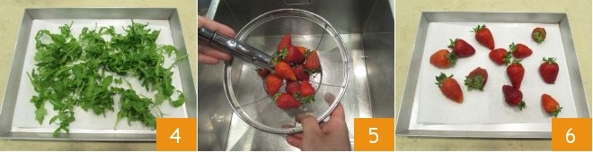 indem Sie sie ebenfalls waschen und sorgfältig trocknen 4. Waschen Sie auch die Erdbeeren 5 mit kaltem Wasser und trocknen Sie sie ab 6,