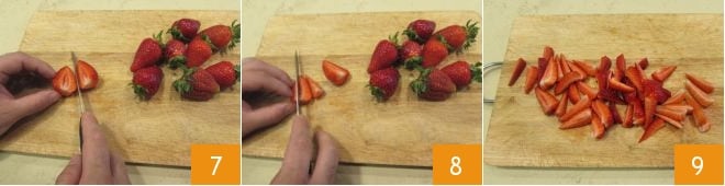 dann schneiden Sie sie in Hälften 7 und Viertel 8; entfernen Sie die grünen Blätter und legen Sie sie beiseite 9.
