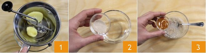 Um die salzigen Krapfen mit Kartoffeln und Emmentaler zuzubereiten, kocht zuerst die Kartoffeln, gießt sie ab und passiert sie durch die Kartoffelpresse (oder einen Kartoffelstampfer) 1. Löst die Hefe im Wasser auf 2 und fügt das Malz hinzu 3.