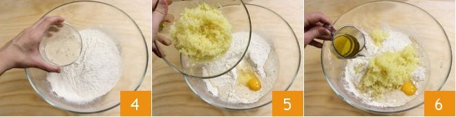 Siebt die beiden Mehlsorten in eine große Schüssel und fügt die aufgelöste Hefe 4, das Ei, die zerdrückten Kartoffeln 5 und das Öl hinzu 6.