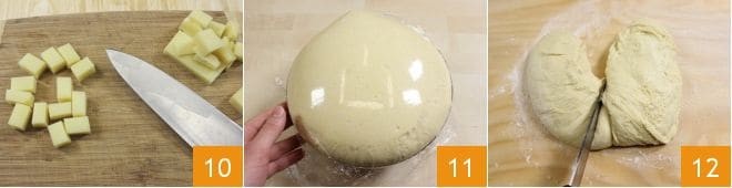 Schneidet inzwischen den Käse in Würfel 10. Wenn der Teig sein Volumen verdoppelt hat 11, legt ihn auf ein bemehltes Arbeitsbrett und teilt ihn in zwei Hälften 12.