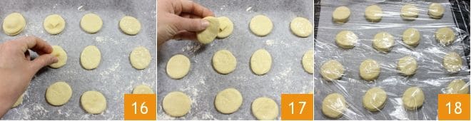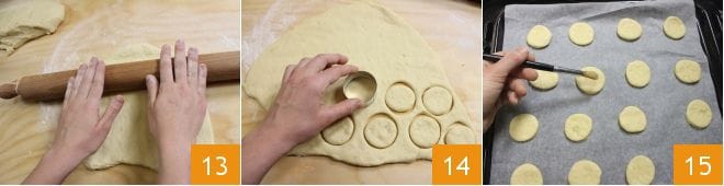 Rollt das erste Stück mit einem Nudelholz zu einem halben Zentimeter dicken Teigblatt aus 13 und stecht mit einem Ausstecher mit einem Durchmesser von 5 cm 20 Kreise aus 14. Legt sie auf ein mit Backpapier bedecktes und leicht bemehltes Backblech oder Tablett. Bestreicht sie mit dem Eiweiß 15 und