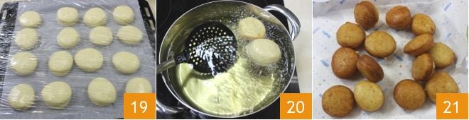 Erhitzt das Samenöl (die Temperatur sollte etwa 180°C betragen) und wenn eure Krapfen aufgegangen sind 19, frittiert sie in heißem Öl (180°C) für ein paar Minuten, dreht sie, damit sie auf beiden Seiten goldbraun werden 20. Lasst sie abtropfen und legt sie auf ein Tablett mit Küchenpapier 21. Vor dem Servieren mit Salz und schwarzem Pfeffer bestreuen: Die salzigen Krapfen mit Kartoffeln und Emmentaler sind bereit, genossen zu werden!