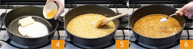 Das Popcorn ist bereit, karamellisiert zu werden. In demselben Topf, in dem Sie das Popcorn zubereitet haben (es ist nicht nötig, ihn zu waschen), geben Sie den Zucker, die gesalzene Butter und den Honig hinein 4. Kochen Sie bei hoher Hitze, alles beginnt schon nach wenigen Minuten zu schmelzen. Rühren Sie kontinuierlich mit einem Holzspatel um 5. Nach einigen Minuten beginnt das im Fett enthaltene Wasser zu verdampfen, und das Karamell beginnt, einen dicken, dichten Schaum zu bilden. Nach etwa 5-6 Minuten beginnt es, eine bernsteinfarbene Farbe und eine klebrige Konsistenz anzunehmen: Es ist Zeit, schnell und kontinuierlich zu rühren und die Hitze zu reduzieren, bevor Sie sofort das Natron hinzufügen 6. Rühren Sie mit dem Holzspatel um und Sie werden sehen, dass sich schnell eine schaumige Masse bildet.