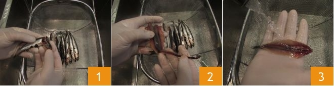 Um die Sardellen alla pizzaiola vorzubereiten, beginnt ihr mit der Reinigung des Fisches. Beginnt damit, den Kopf zu entfernen 1, dann entfernt ihr auch die Mittelgräte, indem ihr sie vorsichtig herauszieht 2, auf diese Weise öffnet ihr die Sardellen wie ein Buch und spült sie unter einem dünnen Wasserstrahl ab, um eventuelle Rückstände zu entfernen, und achtet darauf, die Fischfilets nicht zu brechen 3.
