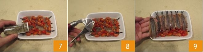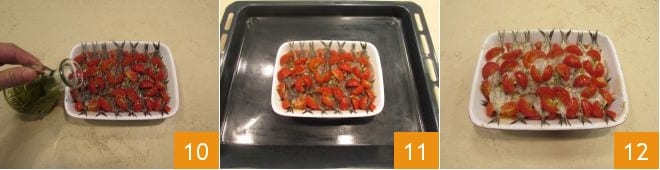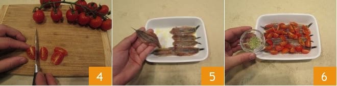 Wascht die Kirschtomaten und schneidet sie in 4 Teile 4 und haltet sie bereit zur Verwendung. In einer mit 25 g nativem Olivenöl extra eingefetteten Auflaufform legt ihr die geöffneten Sardellenfilets entlang der Länge der Form 5, dann die geschnittenen Kirschtomaten und getrockneten Oregano 6.