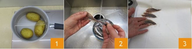 Um die Sardellen-Törtchen zuzubereiten, beginnen Sie damit, die Kartoffeln in einem Topf mit reichlich Wasser 1 für etwa 20-30 Minuten zu kochen, bis sie weich sind, wenn Sie mit einer Gabel hineinstechen. In der Zwischenzeit widmen Sie sich der Reinigung der Sardellen. Lösen Sie vorsichtig den Kopf und die Eingeweide, und entfernen Sie dann das zentrale Rückgrat 2, ohne sie in der Mitte zu teilen, sondern belassen Sie sie ganz. Legen Sie sie auf ein mit Küchenpapier ausgelegtes Tablett 3.
