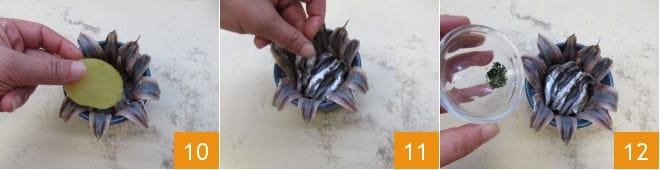Legen Sie dann eine Scheibe Kartoffel in die Mitte der Sardellen 10 und legen Sie ein paar Sardellenfilets horizontal, um die Kartoffelscheibe zu bedecken 11. Salzen, pfeffern, fügen Sie den gehackten Thymian 12 und die Zitronenschale hinzu.