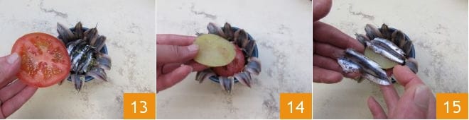 Legen Sie eine Tomatenscheibe 13, eine weitere Kartoffelscheibe 14 und bedecken Sie sie mit Sardellen 15.