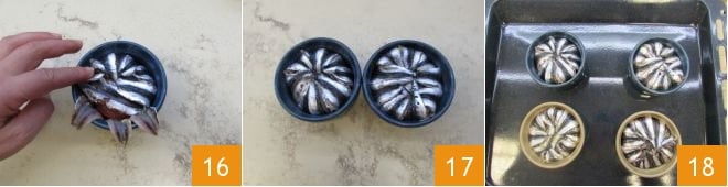 Falten Sie die Filets, mit denen Sie die Form ausgekleidet haben, nach innen 16, wiederholen Sie den Vorgang für alle Törtchen 17 und legen Sie sie auf ein Backblech 18.