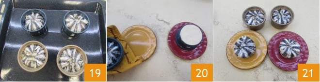 Backen Sie im vorgeheizten statischen Ofen bei 180° für 10 Minuten (bei Verwendung des Umluftofens backen Sie bei 160° für 7-8 Minuten). Nehmen Sie die Törtchen aus dem Ofen 19 und lassen Sie sie einige Minuten abkühlen, dann stürzen Sie die Formen 20, lösen Sie sie und servieren Sie Ihr Sardellen-Törtchen noch warm 21.