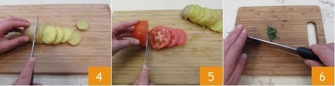 Sobald Ihre Kartoffeln gekocht sind, lassen Sie sie abtropfen, lassen Sie sie abkühlen und schneiden Sie sie in etwa 1 cm dicke Scheiben 4. Waschen Sie die Tomate und schneiden Sie sie ebenfalls in dieselbe Dicke wie die Kartoffeln 5. Hacken Sie dann die Thymianblätter 6 und legen Sie sie beiseite.