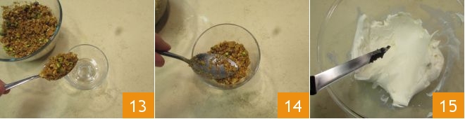 Mischen Sie alles 19, zunächst langsam und dann kräftig, bis Sie eine glatte Creme erhalten 20. Geben Sie diese in einen Spritzbeutel und verwenden Sie ihn, um die Gläser zu füllen 21. Glätten Sie dann die Oberfläche jedes Glases mit der Rückseite eines Teelöffels.