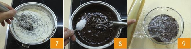 Fahrt fort, den Teig mit dem Schneebesen zu kneten 7, bis sich die trockenen Zutaten gut mit dem Rest der Mischung verbunden haben. Schließlich fügt ihr das grobe Salz hinzu 8, dann schaltet ihr die Hitze ab und gebt die Mischung in eine Schüssel. Lasst sie leicht abkühlen und bedeckt sie mit Frischhaltefolie 9. Lasst den Teig im Kühlschrank für etwa 1 Stunde fest werden.