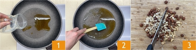 Um die Schokoladen-Granola zuzubereiten, geben Sie den Honig und das Wasser in eine große Antihaftpfanne 1, dann schalten Sie die Hitze ein und rühren Sie bei mittlerer bis niedriger Flamme, bis es zu köcheln beginnt 2. In der Zwischenzeit hacken Sie die Haselnüsse, Cashewkerne und Erdnüsse grob 3.