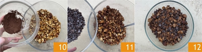 Sobald sie abgekühlt ist, geben Sie die Granola in eine Schüssel, dann fügen Sie den Kakao 10 und die Schokoladenstückchen 11 hinzu. Gut umrühren und die Schokoladen-Granola nach Belieben verwenden 12!