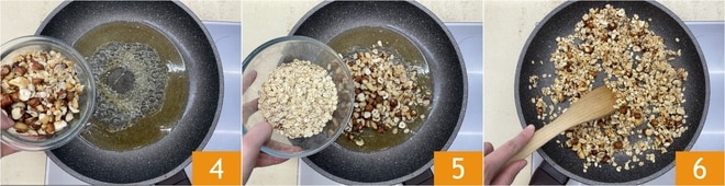 Wenn der Sirup anfängt Blasen zu bilden, erhöhen Sie die Hitze und geben Sie die Nüsse 4 und die Haferflocken 5 hinzu. Rühren Sie mit einem Holzlöffel um, bis alle Zutaten gut vermischt sind, dann reduzieren Sie die Hitze und kochen Sie weitere 20 Minuten bei mittlerer bis niedriger Hitze, wobei Sie alle 5 Minuten umrühren 6.