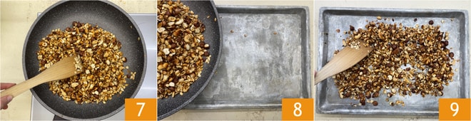 Wenn die Granola goldbraun und leicht geröstet ist 7, schalten Sie die Hitze aus und geben Sie sie in eine Aluschale 8. Verteilen Sie die Mischung gleichmäßig 9 und lassen Sie sie vollständig abkühlen.