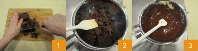 Um die Schokoladenbuttercreme zuzubereiten, beginnen Sie damit, die Zartbitterschokolade zu hacken 1, dann geben Sie sie in eine Schüssel 2 und schmelzen sie im Wasserbad, dabei häufig umrühren 3.