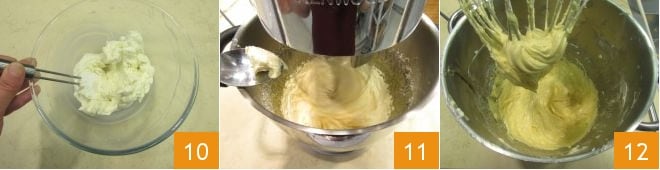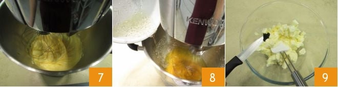 Wenn der Sirup im Topf eine Temperatur von 115° erreicht hat, geben Sie die Eigelbe in die Schüssel einer Küchenmaschine und beginnen Sie, sie aufzuschlagen 7. Sobald der Sirup die angegebene Temperatur erreicht hat, gießen Sie ihn in einem dünnen Strahl in die Küchenmaschine, während diese in Betrieb ist 8, und arbeiten Sie weiter, bis die Masse vollständig abgekühlt ist. In der Zwischenzeit geben Sie die weiche Butter, in Würfel geschnitten, in eine Schüssel, fügen die Samen einer halben Vanilleschote hinzu 9;