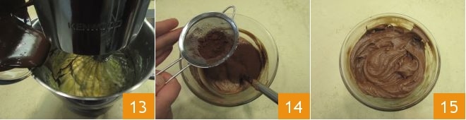 Immer mit den Mixern in Betrieb, fügen Sie langsam die inzwischen abgekühlte geschmolzene Schokolade in die Küchenmaschine 13, dann geben Sie die Creme in eine Schüssel und fügen das gesiebte Kakaopulver hinzu 14. Rühren Sie mit einem Spatel, bis alles gut vermischt ist und Ihre Schokoladenbuttercreme ist bereit 15.