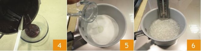 Wenn sie vollständig geschmolzen ist 4, geben Sie sie in eine Schüssel und lassen sie abkühlen, dabei gelegentlich umrühren. In der Zwischenzeit bereiten Sie den Sirup vor, der dazu dient, die Eigelbe zu pasteurisieren und Ihrer Creme eine festere Struktur zu verleihen: Geben Sie den Zucker in einen Topf, fügen das Wasser hinzu 5 und lassen es köcheln, bis es eine Temperatur von 121° erreicht hat 6, für diese Aufgabe können Sie ein Küchenthermometer verwenden.