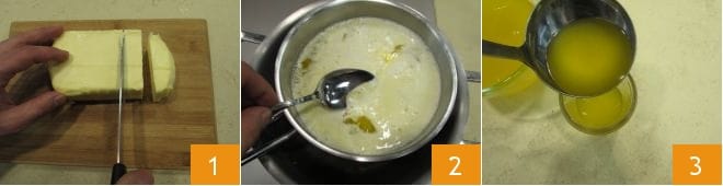 Um die Scholle mit Holländischer Sauce zuzubereiten, beginnen Sie mit der Sauce: Zuerst machen Sie die geklärte Butter; schneiden Sie die Butter 1, lassen Sie sie im Wasserbad schmelzen, achten Sie darauf, sie abzuschäumen 2 und, sobald die Caseine entfernt sind, können Sie sie abgießen 3.