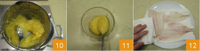 Während Sie weiter rühren, werden Sie sehen, dass Ihre Sauce nach und nach die Farbe 10 ändert, heller wird und ihre Konsistenz, fester wird. Lassen Sie sie etwa 5 Minuten bei schwacher Hitze kochen, dabei ständig rühren, und wenn sie fertig ist, legen Sie sie in eine kleine Schüssel 11. Jetzt widmen Sie sich der Zubereitung der Scholle: Trocknen Sie die Schollenfilets mit Küchenpapier 12