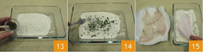 geben Sie das Mehl in eine Auflaufform, fügen Sie den gehackten Thymian hinzu 13, und mischen Sie mit einer Gabel, damit es gleichmäßig verteilt wird 14. Dann mehlieren Sie die Schollenfilets gut von beiden Seiten 15.