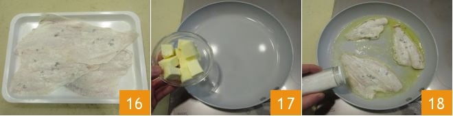 Nachdem alle Filets gemehlt sind 16, erhitzen Sie die Butter in einer beschichteten Pfanne 17, legen Sie dann vorsichtig die Filets hinein 18, und würzen Sie mit Salz.