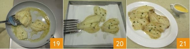Braten Sie die Filets ein paar Minuten auf jeder Seite, achten Sie darauf, sie sehr vorsichtig zu wenden 19, da sie leicht zerfallen. Kochen Sie noch ein paar Minuten, dann legen Sie die Filets auf Küchenpapier 20. Servieren Sie Ihre Filets mit der zuvor zubereiteten Holländischen Sauce 21.
