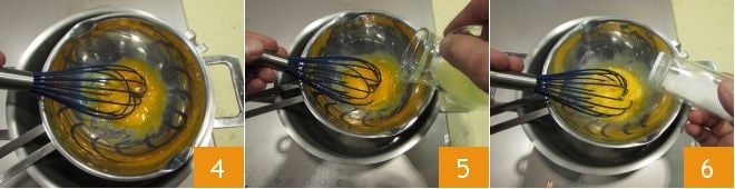 Bereiten Sie inzwischen die Sauce zu: Es ist sehr wichtig, dass das Kochen im Wasserbad erfolgt, also denken Sie daran, dass das Wasser nicht den Topf berühren und niemals zum Kochen kommen darf. Geben Sie die Eigelbe in den Topf und schlagen Sie sie mit einem Schneebesen auf 4, mischen Sie und fügen Sie den Zitronensaft 5 sowie das Salz 6 hinzu,