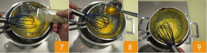 den weißen Pfeffer 7 und dann fügen Sie die geklärte Butter in einem dünnen Strahl hinzu 8, und schlagen Sie weiter mit dem Schneebesen 9.