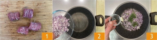 Um das Schweinefilet mit Rotweinsauce vorzubereiten, beginnen Sie damit, das Filet mit Küchengarn zu binden, sodass die Filets ihre Form beim Garen behalten 1. Beginnen Sie mit der Zubereitung der Weinsauce: Geben Sie die gehackten Schalotten 2, die Aromakräuter, den Knoblauch und die Pfefferkörner 3 in einen kleinen Topf.