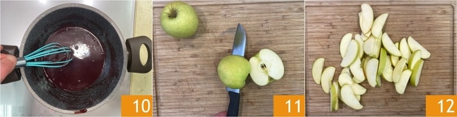 Rühren Sie mit einem Schneebesen, um die Butter gut aufzulösen 10. Stellen Sie die Weinsauce beiseite und kümmern Sie sich um die Äpfel. Halbieren Sie sie und entfernen Sie das Kerngehäuse 11, dann schneiden Sie sie in Spalten, ohne sie zu schälen 12.