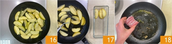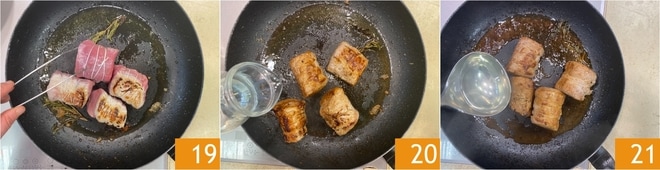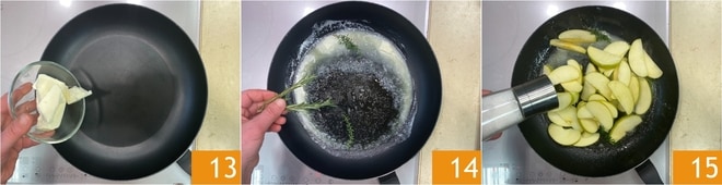 Vermeiden Sie das Umrühren, sondern drehen Sie mit einer Zange 16. Nach der Garzeit der Äpfel nehmen Sie sie heraus und halten sie warm 17. Legen Sie in dieselbe Pfanne die zuvor gebundenen Schweinefilets 18.