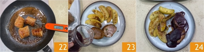 Das Filetfleisch muss eine Kerntemperatur von mindestens 65°C erreichen 22, überwachen Sie dies mit einem Fleischthermometer. Nach dem Garen richten Sie die Filets mit den Äpfeln und der warm gehaltenen Sauce an 23. Servieren Sie das Schweinefilet mit der Weinsauce sofort 24