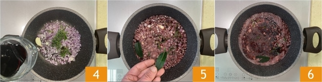Gießen Sie den Rotwein 4 und zwei Lorbeerblätter 5 hinzu. Bringen Sie es zum Kochen, bis es reduziert ist, das dauert etwa 10 Minuten bei mittlerer bis hoher Hitze 6.