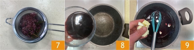 Filtern Sie die Mischung durch ein Sieb 7, gießen Sie den Wein 8 in denselben Topf und lassen Sie die Sauce etwa 10 Minuten auf dem Herd reduzieren. Nehmen Sie den Topf vom Herd und geben Sie die kalte Butter nach und nach hinzu 9.