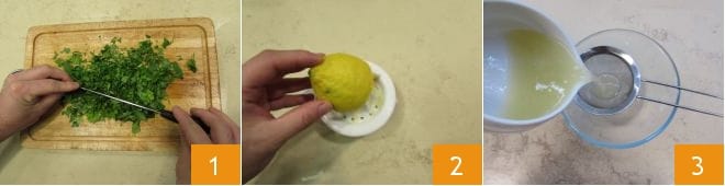 Um den Schwertfisch im Salmoriglio zuzubereiten, beginnen Sie mit der Zubereitung der Marinade: Waschen und trocknen Sie die Petersilie gründlich, dann hacken Sie sie fein 1 und legen Sie sie beiseite. Schneiden Sie die Zitrone in zwei Hälften und pressen Sie den Saft aus 2, den Sie durch ein feines Sieb filtrieren 3: Sie sollten etwa 130 g erhalten.