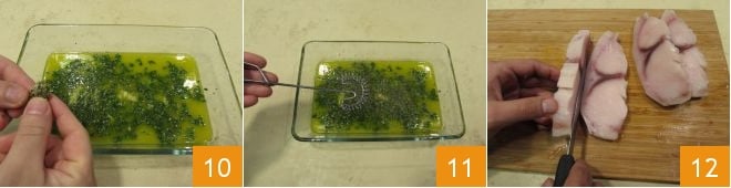 Aromatisieren Sie auch mit den Oreganoblättern 10 und schlagen Sie die Mischung erneut energisch mit dem Spiralbesen 10: Sie sollten eine homogene Emulsion erhalten. Schneiden Sie nun den Schwertfisch, sodass die Scheiben etwa 1 cm 12 dick sind: Sie sollten etwa 4 Scheiben von jeweils etwa 120 g erhalten.