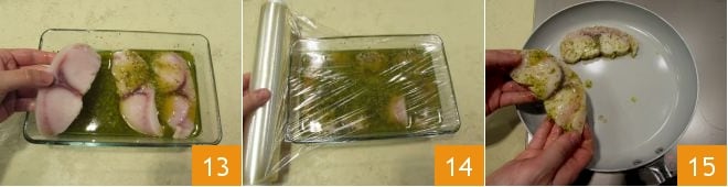 Übertragen Sie sie in die Schüssel mit der Marinade, die sie vollständig bedecken sollte, 13 und bedecken Sie sie mit transparenter Frischhaltefolie 14. Stellen Sie sie in den Kühlschrank und lassen Sie sie mindestens 1 Stunde marinieren. Nach der benötigten Zeit nehmen Sie den Fisch aus dem Kühlschrank, entfernen Sie die Folie und lassen Sie die Schwertfischfilets abtropfen (die Marinade nicht wegwerfen: Sie wird später benötigt). Legen Sie sie dann in eine bereits heiße Pfanne 15
