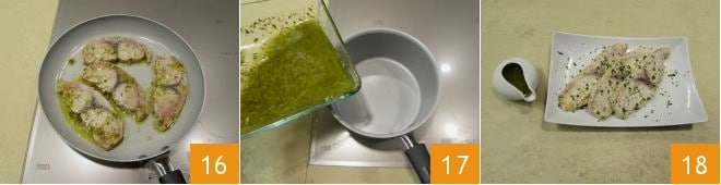 und braten Sie die Filets 4-5 Minuten bei schwacher Hitze, indem Sie sie nur einmal wenden 16: Sie sollten auf jeder Seite leicht goldbraun sein. In der Zwischenzeit gießen Sie die Marinade (Salmoriglio) in einen hohen, antihaftbeschichteten Topf und kochen sie etwa 5 Minuten bei niedriger Hitze 17: Auf diese Weise reduzieren Sie die Marinade, die dicker und kräftiger wird. Zu diesem Zeitpunkt sind sowohl der Schwertfisch als auch die Marinade bereit: Legen Sie die Fischscheiben auf einen Teller und servieren Sie Ihren Schwertfisch im Salmoriglio mit einem Krug, der die Marinade enthält 18!