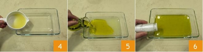 Gießen Sie diesen nun in eine große Schüssel, die für die Marinade 4 verwendet wird, und fügen Sie auch das Öl hinzu 5, indem Sie es mit Salz 6 und Pfeffer abschmecken.
