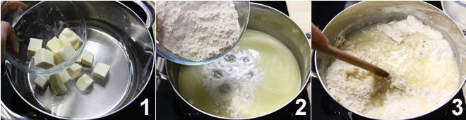 Geben Sie Wasser, Butter (oder Schmalz) und Salz 1 in einen kleinen Topf und fügen Sie, sobald es kocht, das gesamte Mehl auf einmal hinzu 2, und rühren Sie die Zutaten auf dem Herd mit einem Holzlöffel für mindestens 2-3 Minuten 3.