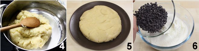 bis sich die Masse vom Topf löst 4. Lassen Sie sie abkühlen 5 und in der Zwischenzeit können Sie die Schokoladenstückchen zur Ricottacreme hinzufügen 6 und sie erneut in den Kühlschrank stellen, bis die Sfinci frittiert sind.