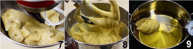 Geben Sie den Teig in eine Küchenmaschine mit Flachrührer 7 (oder arbeiten Sie ihn von Hand mit einem Holzlöffel) und kneten Sie den Teig für 1 Minute, dann fügen Sie die Eier nacheinander hinzu: Fügen Sie das nächste Ei erst hinzu, wenn das vorherige vollständig absorbiert wurde. Sie sollten einen glatten, cremigen und dichten Teig erhalten 8. Schmelzen Sie das Schmalz (oder erhitzen Sie das Öl) in einem kleinen Topf, bis es 160-165 °C erreicht, und frittieren Sie dann den Teig, indem Sie ihn in Löffelportionen in den Topf geben 9: Frittieren Sie nicht mehr als 3-4 Sfinci gleichzeitig, um die Öltemperatur nicht zu stark zu senken und um genügend Platz zu haben, wenn die Sfinci anfangen zu wachsen.