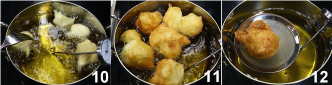 Drehen Sie die Sfinci oft mit zwei Gabeln 10, um sie auf allen Seiten zu bräunen und sie gut aufgehen zu lassen 11. Bei dieser Temperatur sollten die Sfinci mindestens 10-15 Minuten frittieren. Wenn sie gut gebräunt sind, heben Sie sie mit einem Schaumlöffel 12 heraus und legen Sie sie auf ein Tablett, das mit Küchenpapier ausgelegt ist.