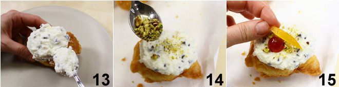 Wenn Sie mit dem Frittieren fertig sind, lassen Sie die Sfinci etwas abkühlen, dann nehmen Sie die Ricottacreme, arbeiten Sie sie einige Sekunden mit einem Holzlöffel und bedecken Sie dann mit einem Löffel die Oberfläche der Sfinci 13. Garnieren Sie jeden Sfincio mit gehackten Pistazien 14, einer kandierten Kirsche und einer kandierten Orangenschale 15. Servieren Sie sie sofort.