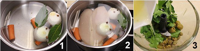 Um die Blätterteigstücke mit Oliven und grünem Hühnersalat zuzubereiten, beginnen Sie damit, in einem Topf mit reichlich kaltem Wasser 1 geschälte und halbierte Karotte, 1 geschälte und ebenfalls halbierte Zwiebel, Lorbeerblätter und Gewürznelken 1 zu geben. Wenn das Wasser zu kochen beginnt, fügen Sie die ganze Hühnerbrust und grobes Salz hinzu und lassen Sie alles etwa 20 Minuten kochen 2. Gießen Sie das Huhn ab und lassen Sie es auf einem Schneidebrett abkühlen. In der Zwischenzeit bereiten Sie die grüne Soße zu 3: Geben Sie Basilikum, Petersilie, Kapern, Oliven, Knoblauch, Öl und Zitronensaft in einen Mixer. Fein hacken und mit Salz abschmecken. Sollte die Mischung zu dick sein, fügen Sie 1 Esslöffel Wasser hinzu.